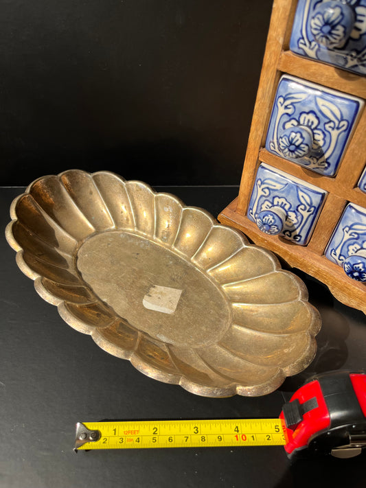 Vintage Silver Plated Tray with Scalloped Edges – Elegant Oval Catchall with Patina